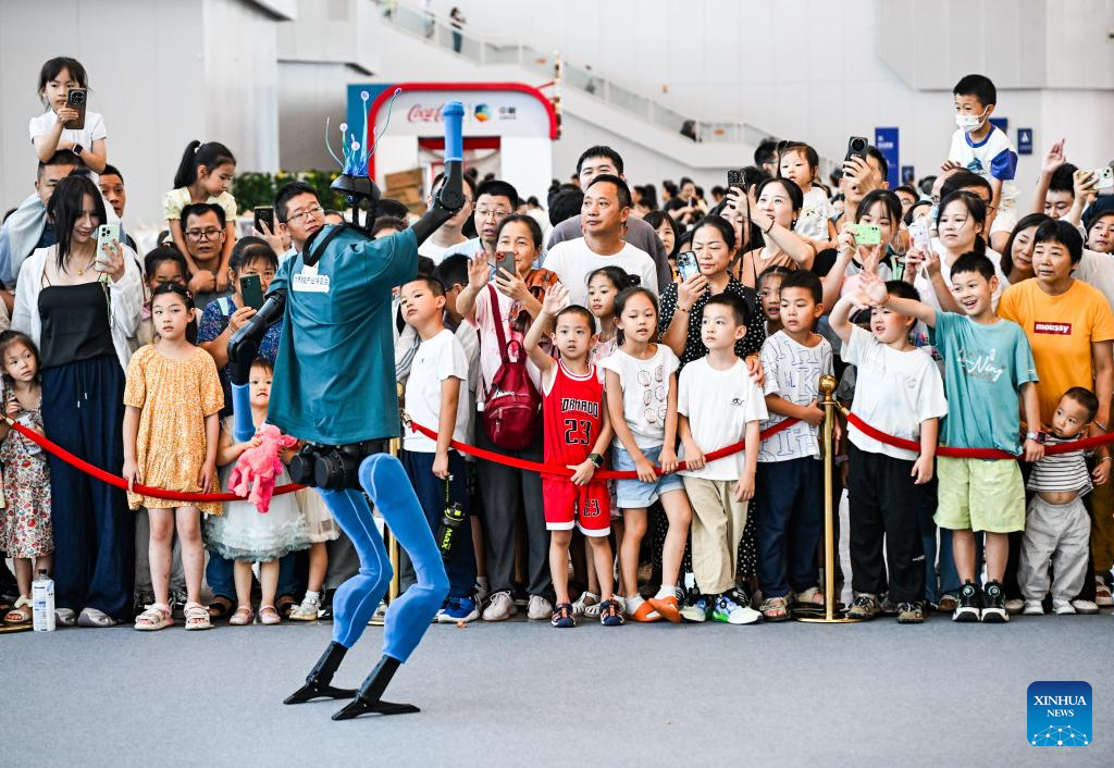 A humanoid robot interacts with visitors during the World Smart Industry Expo 2025 in southwest China's Chongqing Municipality, Sept. 7, 2025.