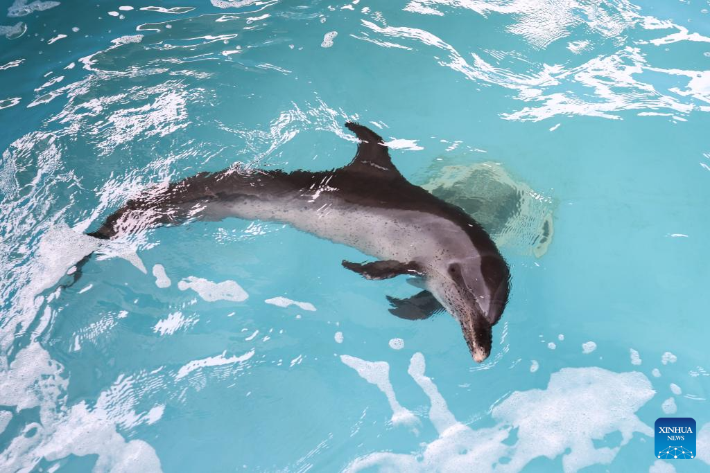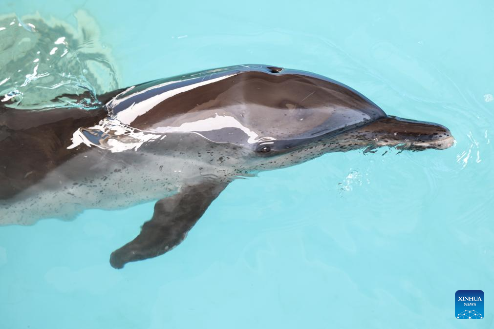 Dolphin "Wan Wan" swims in a pool at a rescue facility in Lingshui, south China's Hainan Province, Sept. 8, 2025. The stranded dolphin "Wan Wan," rescued in Wanning, Hainan this June, has recovered well after nearly three months of care by a rescue team. The dolphin is expected to be released back into the wild in the short future. (Xinhua/Zhang Liyun)