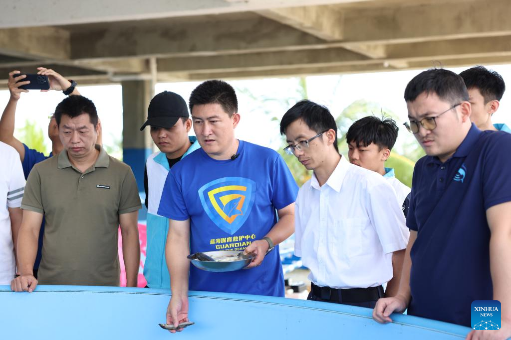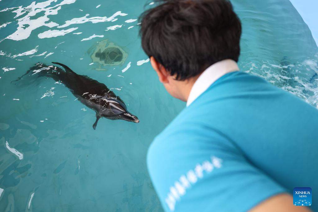 A volunteer inspects dolphin "Wan Wan" at a rescue facility in Lingshui, south China's Hainan Province, Sept. 8, 2025. The stranded dolphin "Wan Wan," rescued in Wanning, Hainan this June, has recovered well after nearly three months of care by a rescue team. The dolphin is expected to be released back into the wild in the short future. (Xinhua/Zhang Liyun)