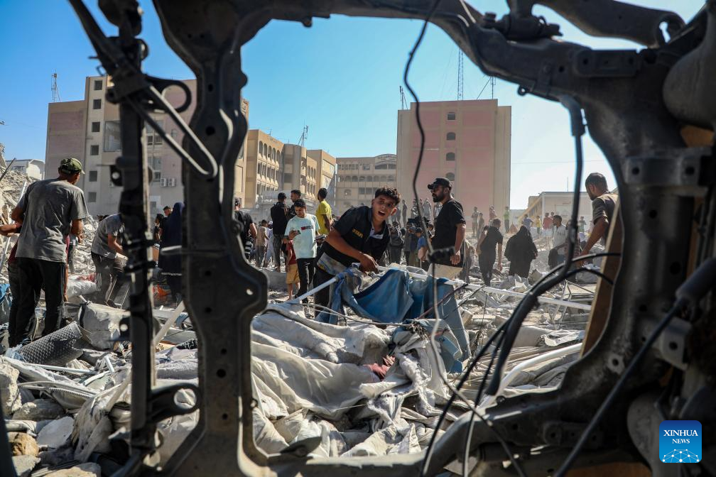 Palestinians inspect the debris of the "Vision" tower following an Israeli airstrike in Gaza City, on Sept. 8, 2025. Israeli forces intensified airstrikes on Gaza City on Monday, including the demolition of the "Vision" tower, a 14-story office building, in the western part of the city. (Photo by Rizek Abdeljawad/Xinhua)