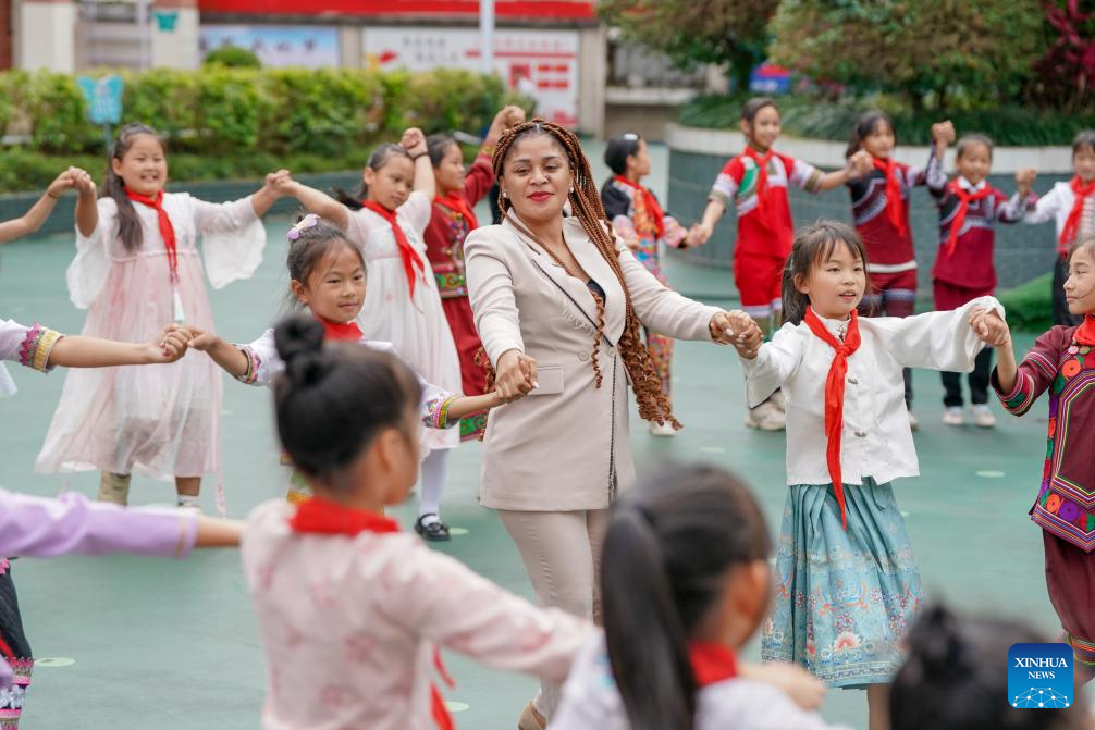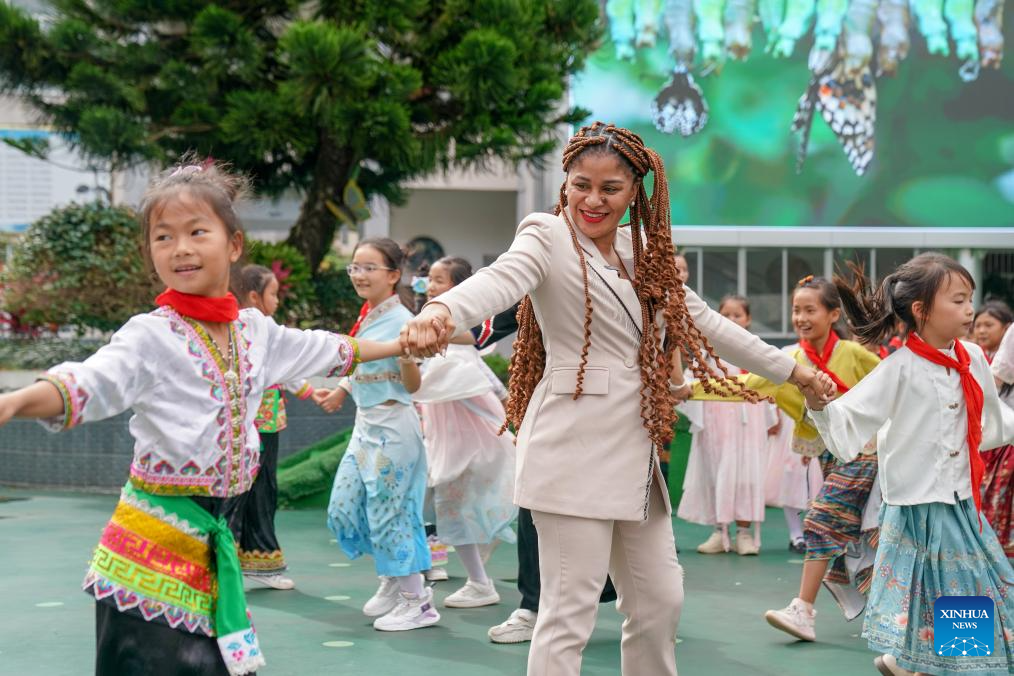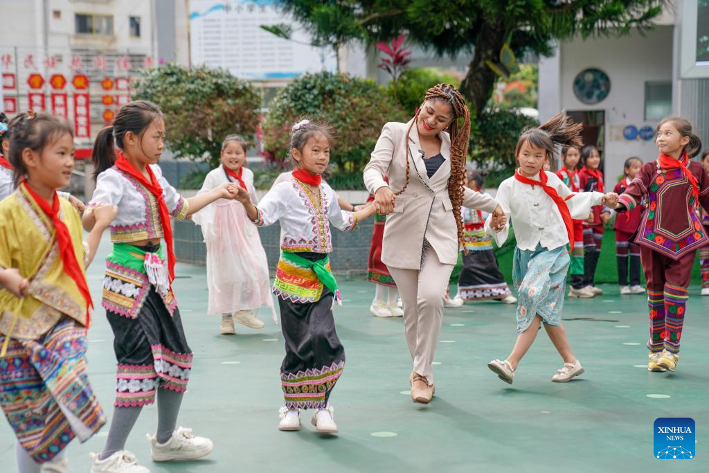 Milagrosa Ada Micha Abeso, an Equatorial Guinean journalist, dances with children at the China-Equatorial Guinea Friendship Primary School in Jinping Miao, Yao and Dai Autonomous County, southwest China's Yunnan Province, Sept. 9, 2025.