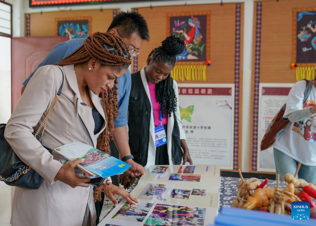 Milagrosa Ada Micha Abeso (front), an Equatorial Guinean journalist, views photos at the China-Equatorial Guinea Friendship Primary School in Jinping Miao, Yao and Dai Autonomous County, southwest China's Yunnan Province, Sept. 9, 2025.
