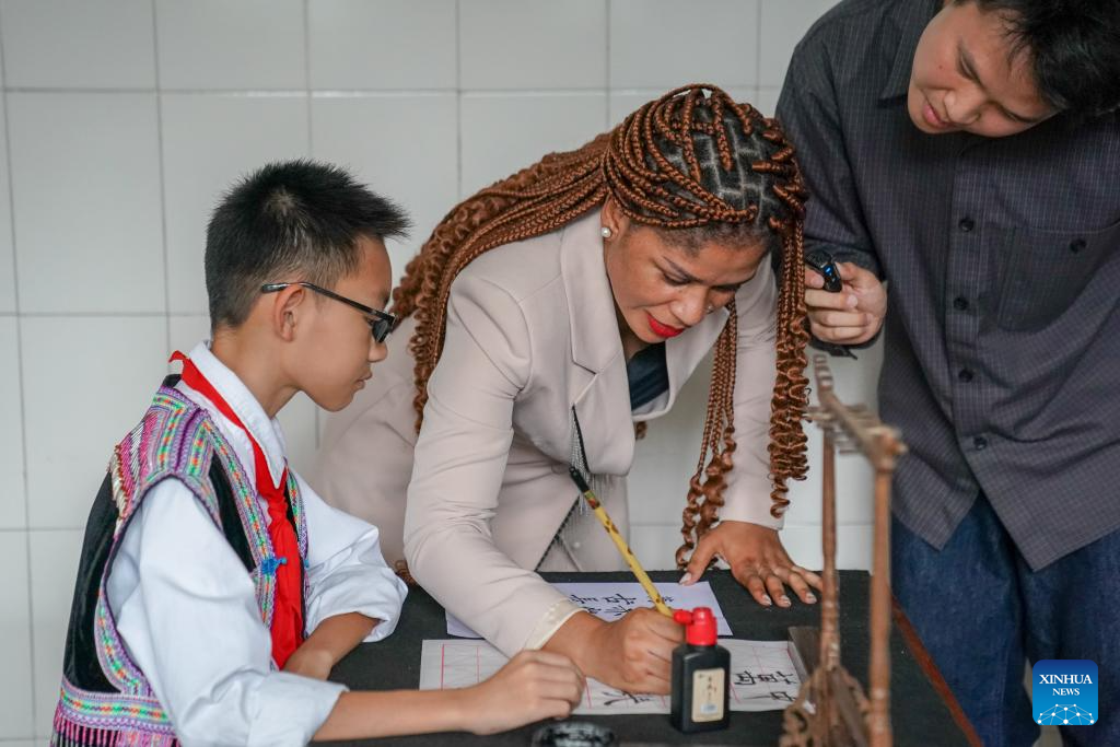 Milagrosa Ada Micha Abeso, an Equatorial Guinean journalist, writes Chinese calligraphy at the China-Equatorial Guinea Friendship Primary School in Jinping Miao, Yao and Dai Autonomous County, southwest China's Yunnan Province, Sept. 9, 2025.