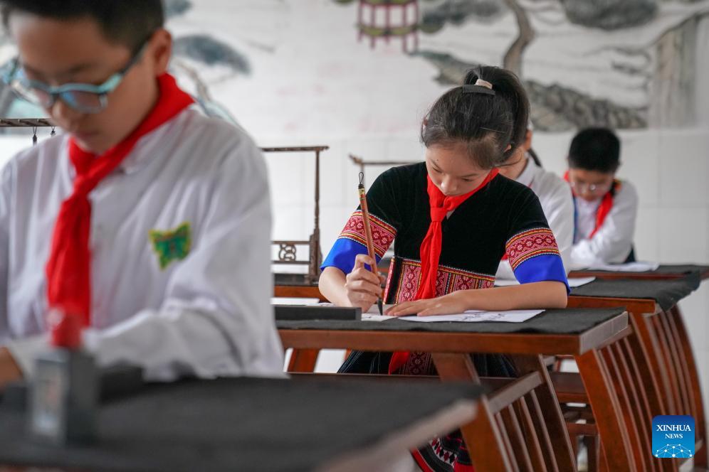 Children write Chinese calligraphy at the China-Equatorial Guinea Friendship Primary School in Jinping Miao, Yao and Dai Autonomous County, southwest China's Yunnan Province, Sept. 9, 2025.
