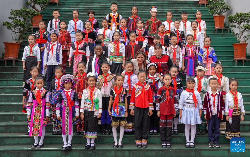 Milagrosa Ada Micha Abeso (C), an Equatorial Guinean journalist, poses for a group photo at the China-Equatorial Guinea Friendship Primary School in Jinping Miao, Yao and Dai Autonomous County, southwest China's Yunnan Province, Sept. 9, 2025.