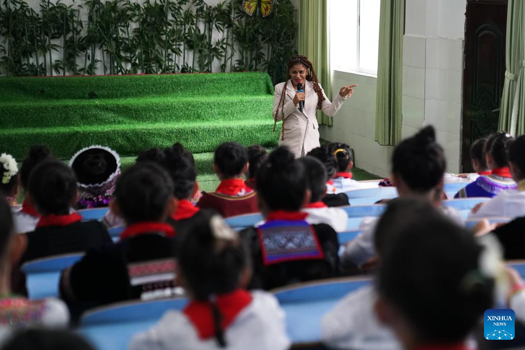 Milagrosa Ada Micha Abeso, an Equatorial Guinean journalist, communicates with children at the China-Equatorial Guinea Friendship Primary School in Jinping Miao, Yao and Dai Autonomous County, southwest China's Yunnan Province, Sept. 9, 2025.