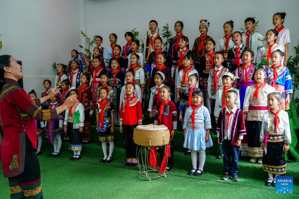 Children greet Milagrosa Ada Micha Abeso, an Equatorial Guinean journalist, with songs at the China-Equatorial Guinea Friendship Primary School in Jinping Miao, Yao and Dai Autonomous County, southwest China's Yunnan Province, Sept. 9, 2025.