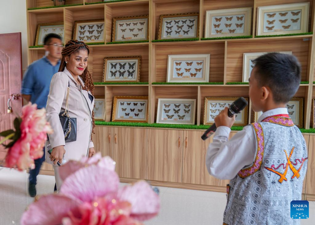 A student shows Milagrosa Ada Micha Abeso, an Equatorial Guinean journalist, the exhibits of the China-Equatorial Guinea Friendship Primary School in Jinping Miao, Yao and Dai Autonomous County, southwest China's Yunnan Province, Sept. 9, 2025.