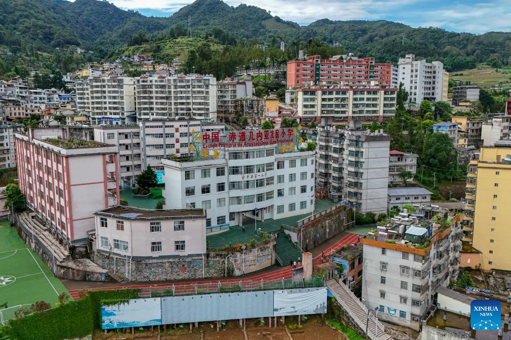 An aerial drone photo taken on Sept. 9, 2025 shows a view of the China-Equatorial Guinea Friendship Primary School in Jinping Miao, Yao and Dai Autonomous County, southwest China's Yunnan Province.