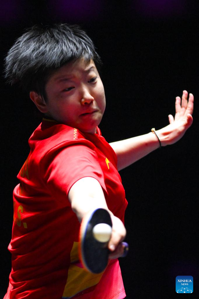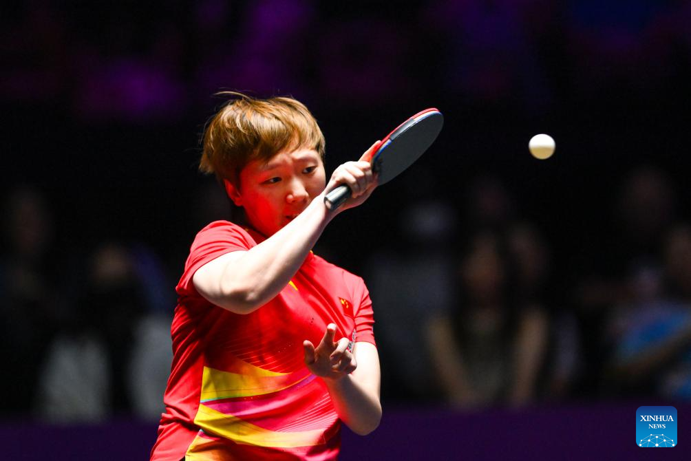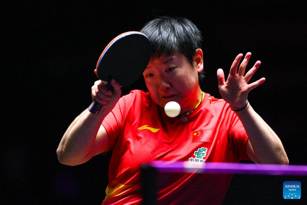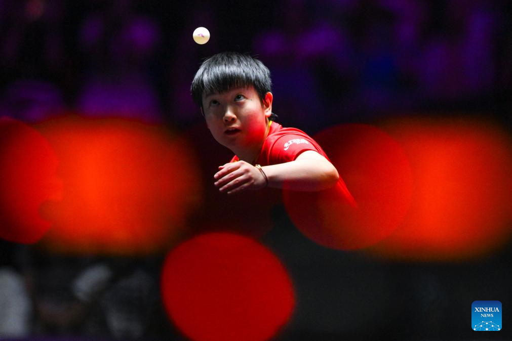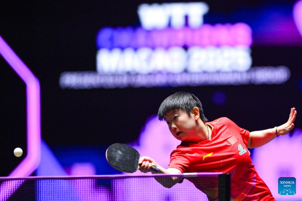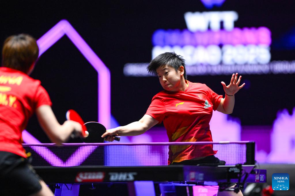 Sun Yingsha of China competes during the women's singles final match against Wang Manyu of China at the 2025 World Table Tennis (WTT) Champions Macao in Macao, south China, Sept. 14, 2025. (Xinhua/Cheong Kam Ka)