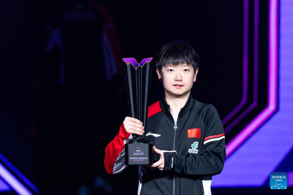 Sun Yingsha of China poses during the trophy presentation after the women's singles final match against Wang Manyu of China at the 2025 World Table Tennis (WTT) Champions Macao in Macao, south China, Sept. 14, 2025. (Xinhua/Cheong Kam Ka)