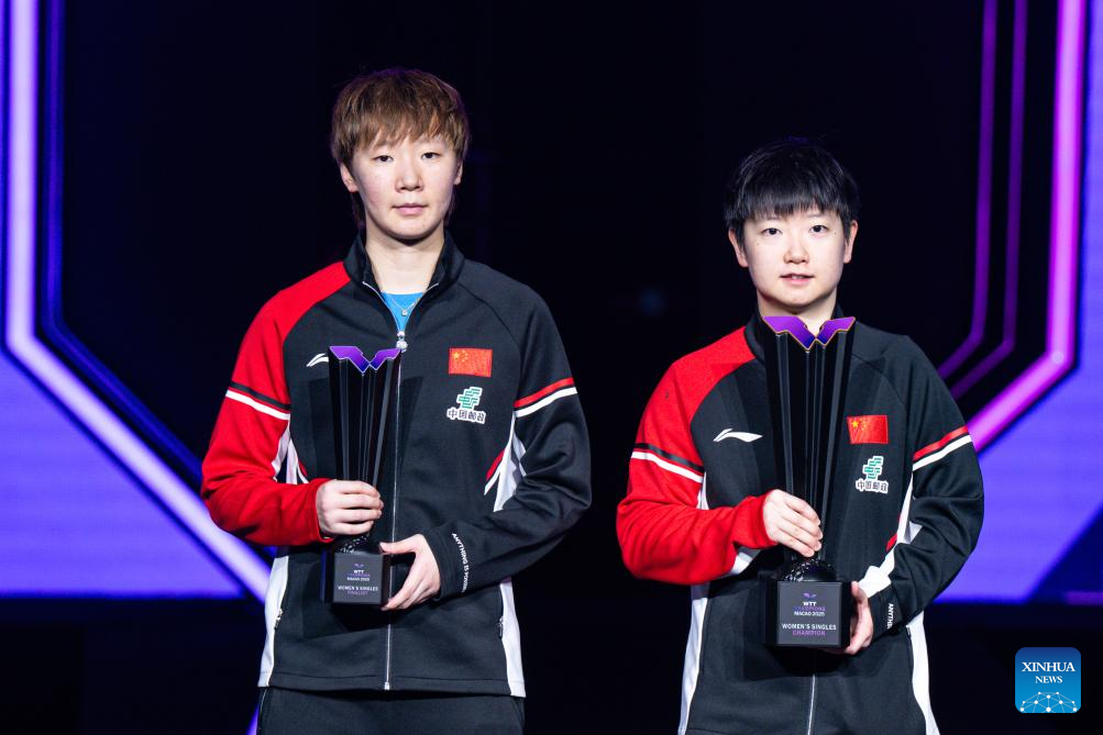 Sun Yingsha (R) of China poses with her compatriot Wang Manyu during the trophy presentation after the women's singles final match at the 2025 World Table Tennis (WTT) Champions Macao in Macao, south China, Sept. 14, 2025. (Xinhua/Cheong Kam Ka)