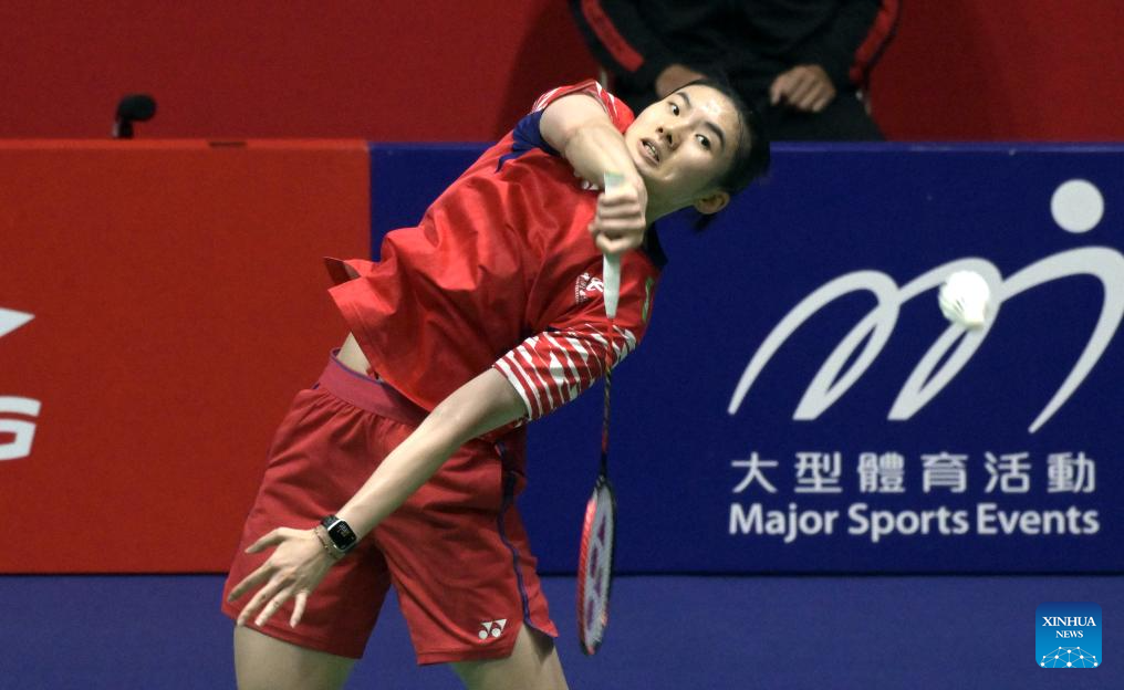 Wang Zhiyi of China hits a return during the women's singles final match against Han Yue of China at Hong Kong Open badminton tournament 2025 in Hong Kong, south China, Sept. 14, 2025. (Xinhua/Lo Ping Fai)