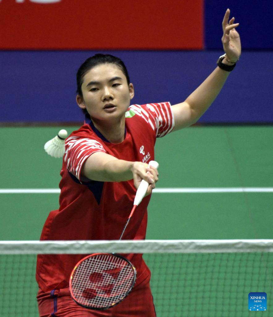 Han Yue of China hits a return during the women's singles final match against Wang Zhiyi of China at Hong Kong Open badminton tournament 2025 in Hong Kong, south China, Sept. 14, 2025. (Xinhua/Lo Ping Fai)