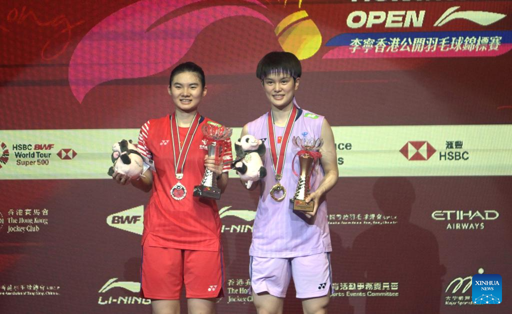 First placed Wang Zhiyi (R) and second placed Han Yue of China pose after the women's singles final match at Hong Kong Open badminton tournament 2025 in Hong Kong, south China, Sept. 14, 2025. (Xinhua/Lo Ping Fai)
