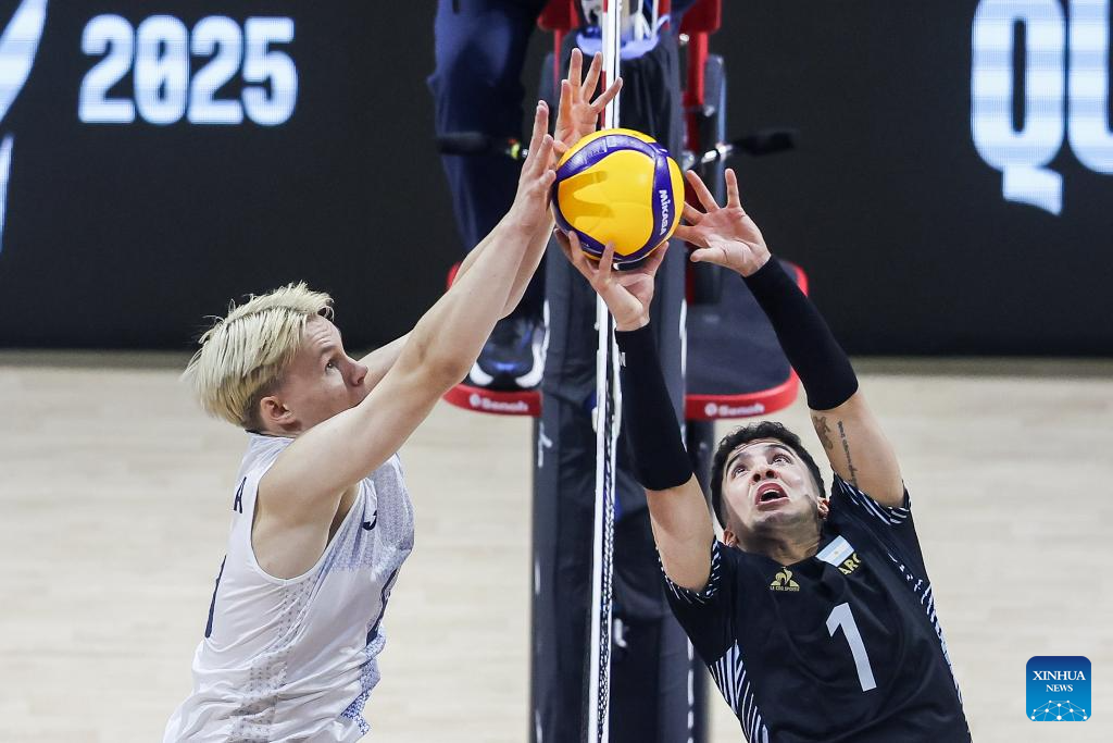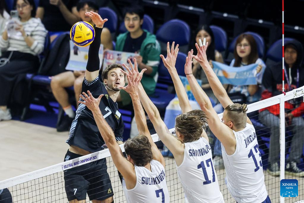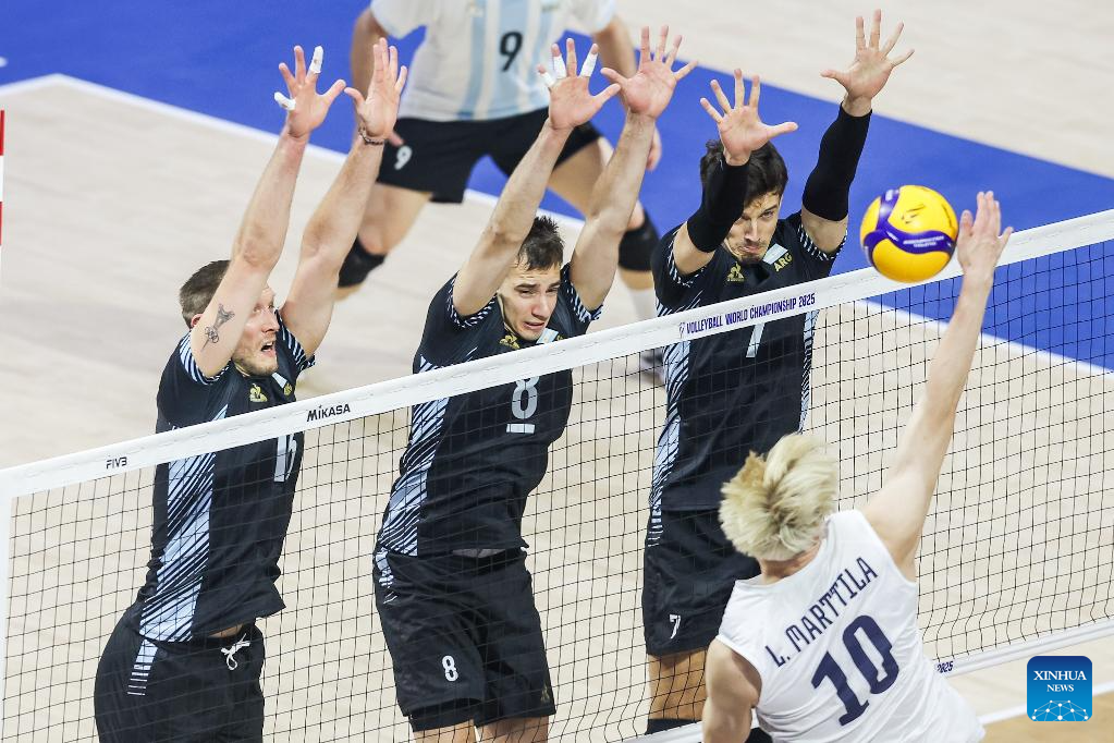Luciano Palonsky (L) of Argentina spikes the ball during the pool C match between Finland and Argentina at the FIVB Men's World Championship 2025 in Quezon City, the Philippines, Sept. 14, 2025. (Xinhua/Rouelle Umali)