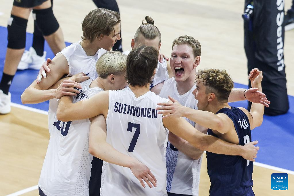 Players of Finland celebrate after scoring a point during the pool C match between Finland and Argentina at the FIVB Men's World Championship 2025 in Quezon City, the Philippines, Sept. 14, 2025. (Xinhua/Rouelle Umali)