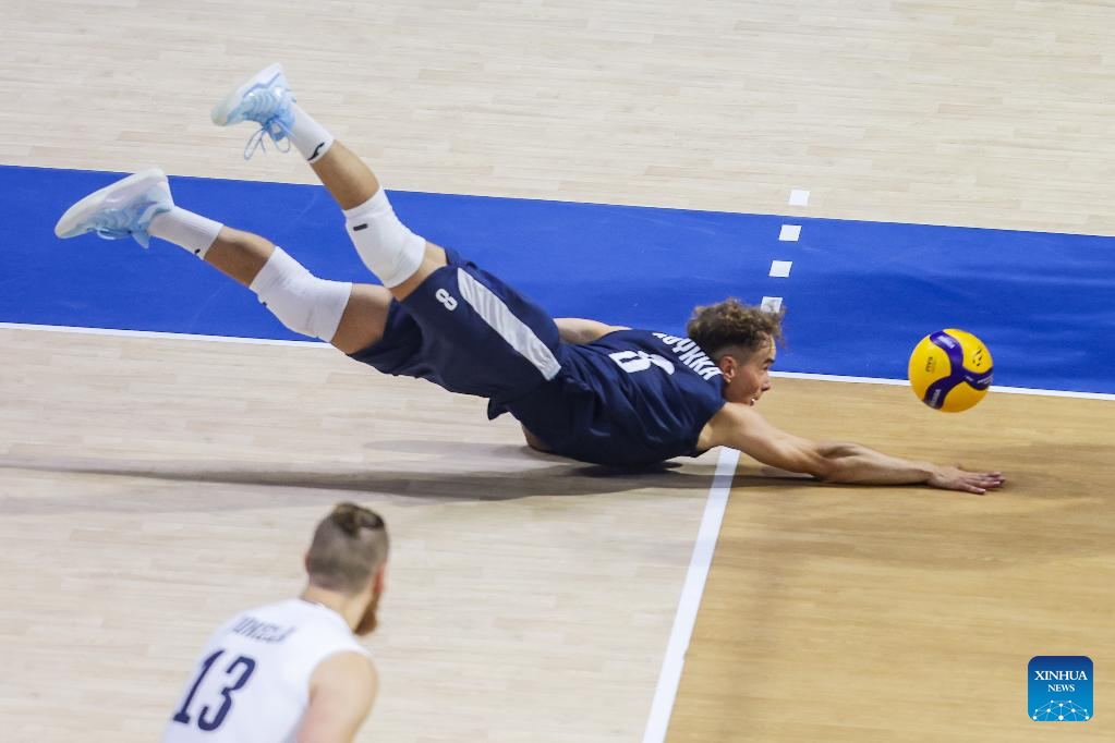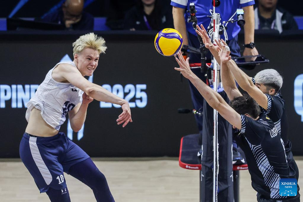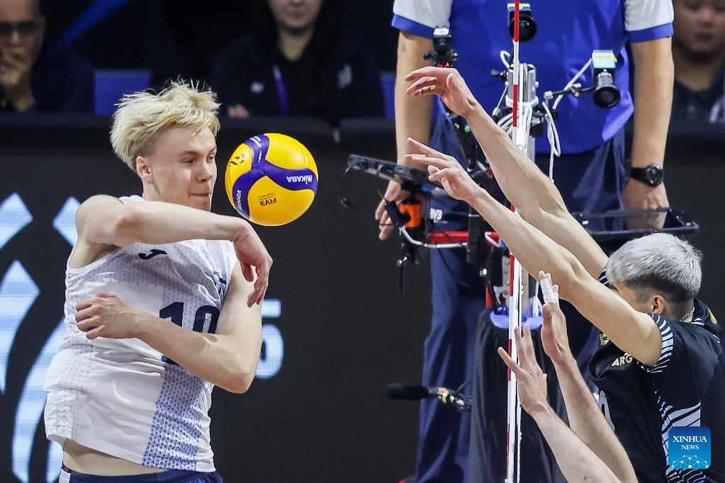 Luka Marttila (L) of Finland competes during the pool C match between Finland and Argentina at the FIVB Men's World Championship 2025 in Quezon City, the Philippines, Sept. 14, 2025. (Xinhua/Rouelle Umali)
