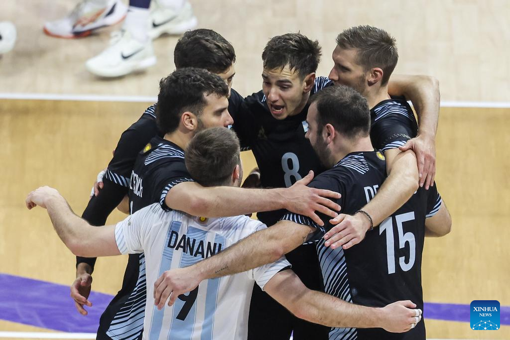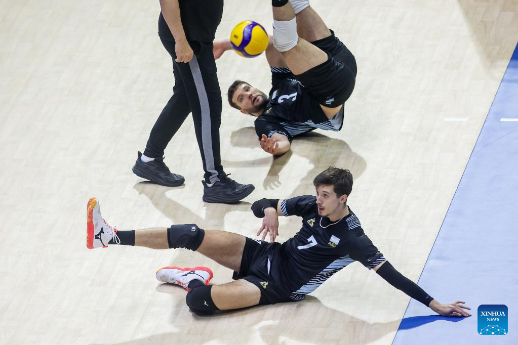 Players of Argentina celebrate after scoring a point during the pool C match between Finland and Argentina at the FIVB Men's World Championship 2025 in Quezon City, the Philippines, Sept. 14, 2025. (Xinhua/Rouelle Umali)
