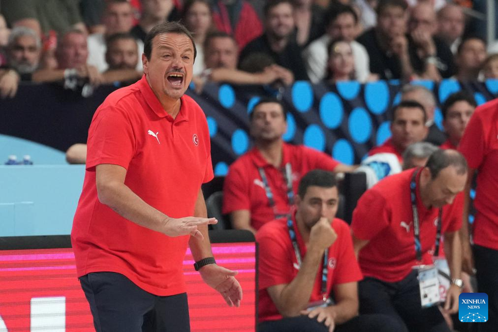 Head coach of Türkiye Ergin Ataman (L) reacts during the FIBA EuroBasket 2025 final match between Germany and Türkiye in Riga, Latvia, on Sept. 14, 2025. (Photo by Edijs Palens/Xinhua)