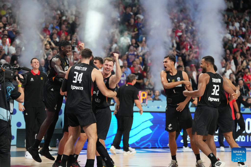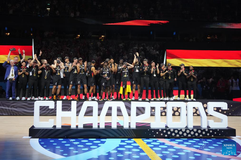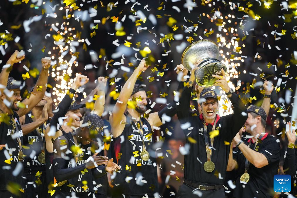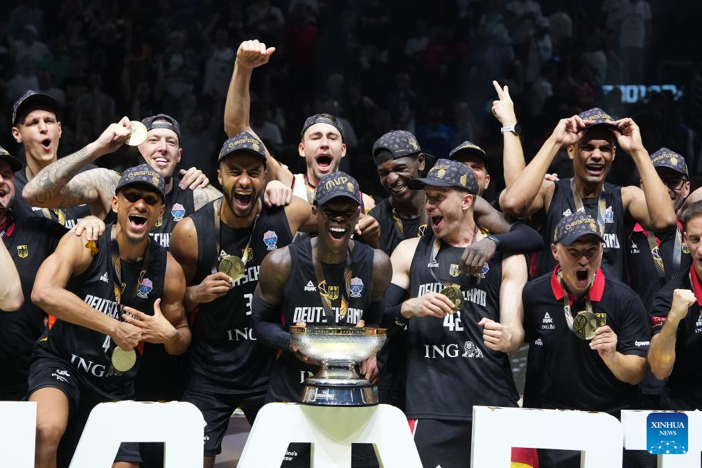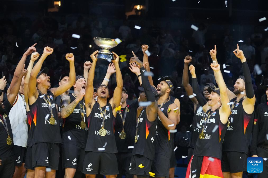 Team Germany celebrate winning the FIBA EuroBasket 2025 final match between Germany and Türkiye in Riga, Latvia, on Sept. 14, 2025. (Photo by Edijs Palens/Xinhua)