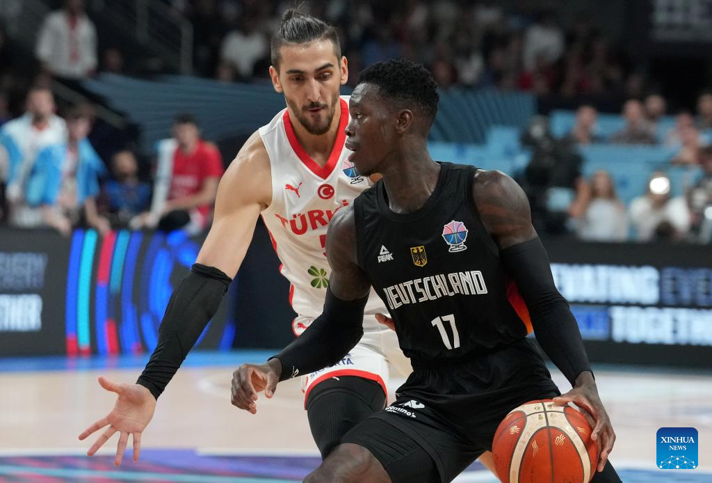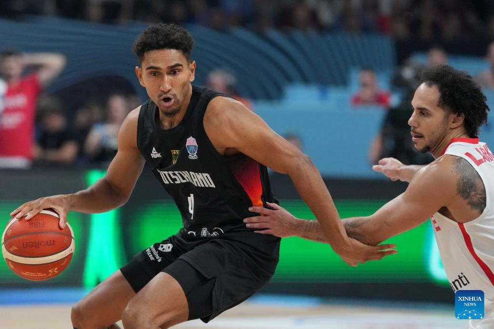 Andreas Obst (R) of Germany vies with Kenan Sipahi of Türkiye during the FIBA EuroBasket 2025 final match between Germany and Türkiye in Riga, Latvia, on Sept. 14, 2025. (Photo by Edijs Palens/Xinhua)