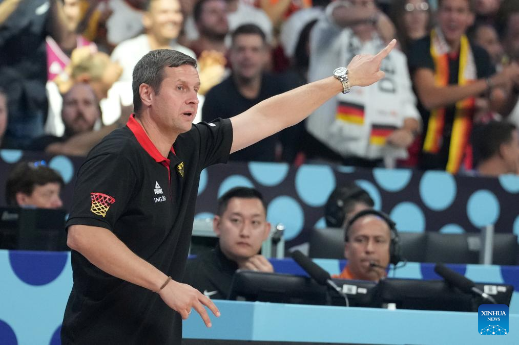 Coach of Germany Alan Ibrahimagic reacts during the FIBA EuroBasket 2025 final match between Germany and Türkiye in Riga, Latvia, on Sept. 14, 2025. (Photo by Edijs Palens/Xinhua)