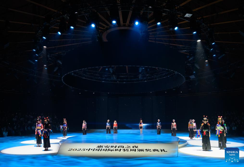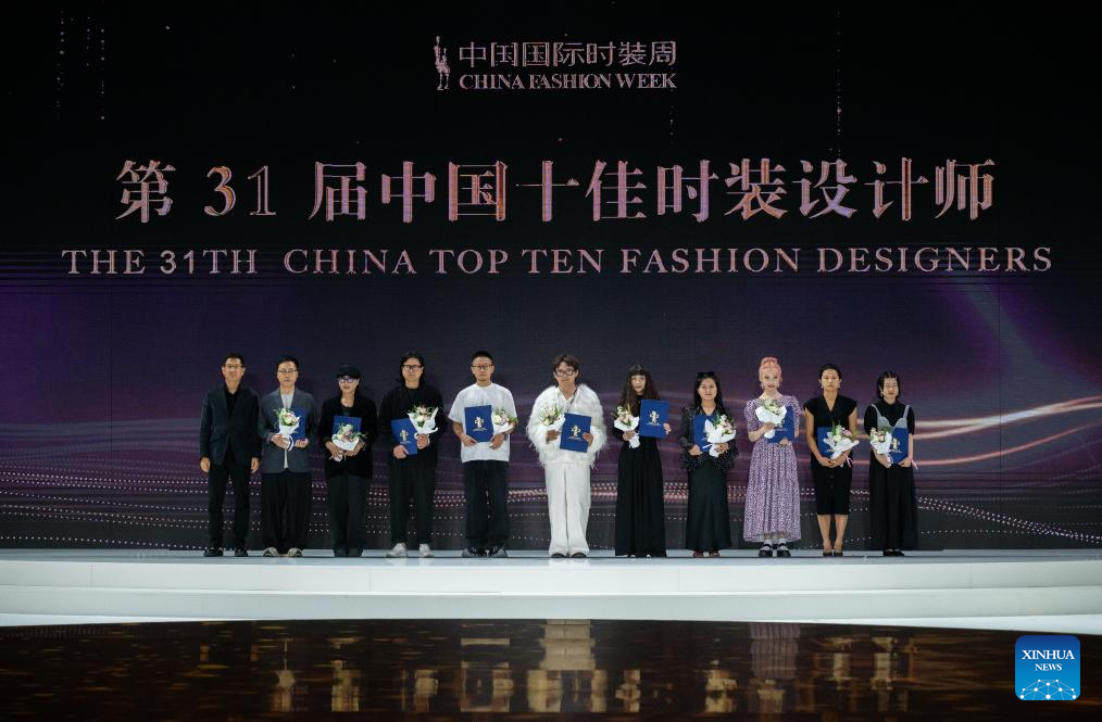 Designers receive awards at the closing show of the 2025 China Fashion Week (Autumn) in Beijing, capital of China, Sept. 14, 2025. (Xinhua/Hu Jingwen)