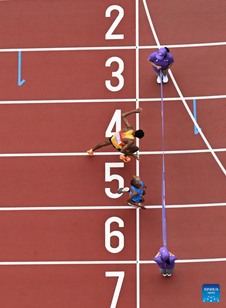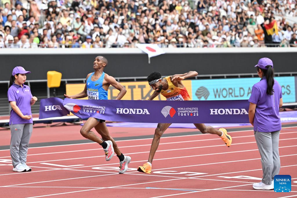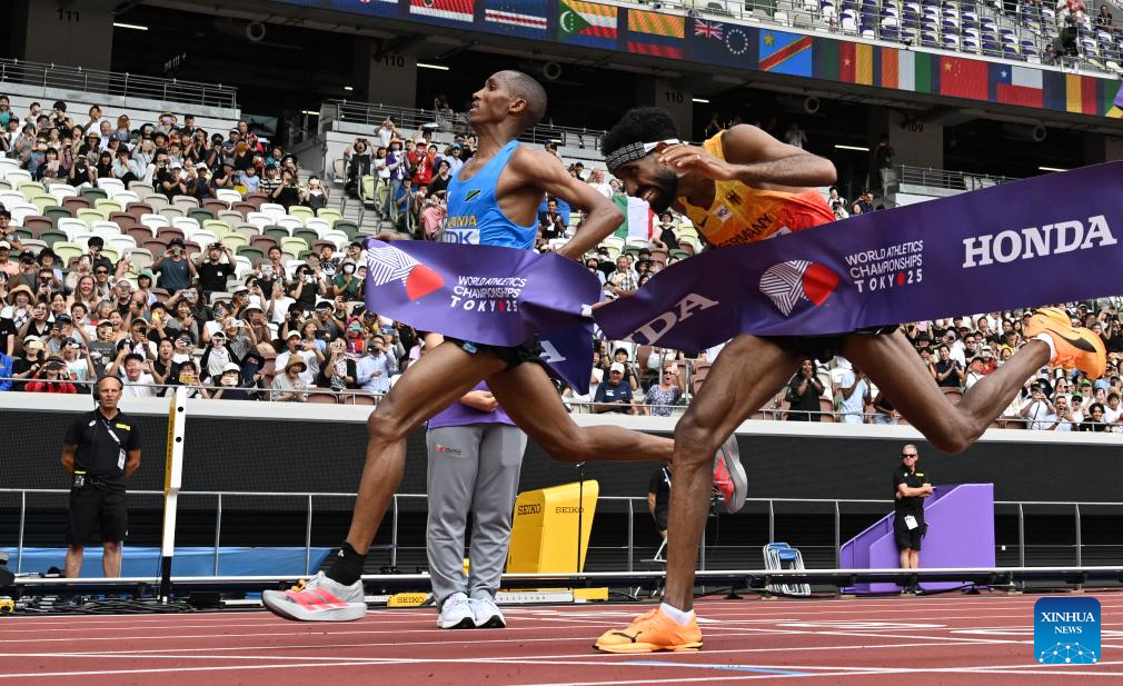 Alphonce Felix Simbu of Tanzania (2nd bottom) and Amanal Petros of Germany (2nd top) cross the finish line during the men's marathon final at the 2025 World Athletics Championships in Tokyo, Japan, Sept. 15, 2025. (Xinhua/Lui Siu Wai)