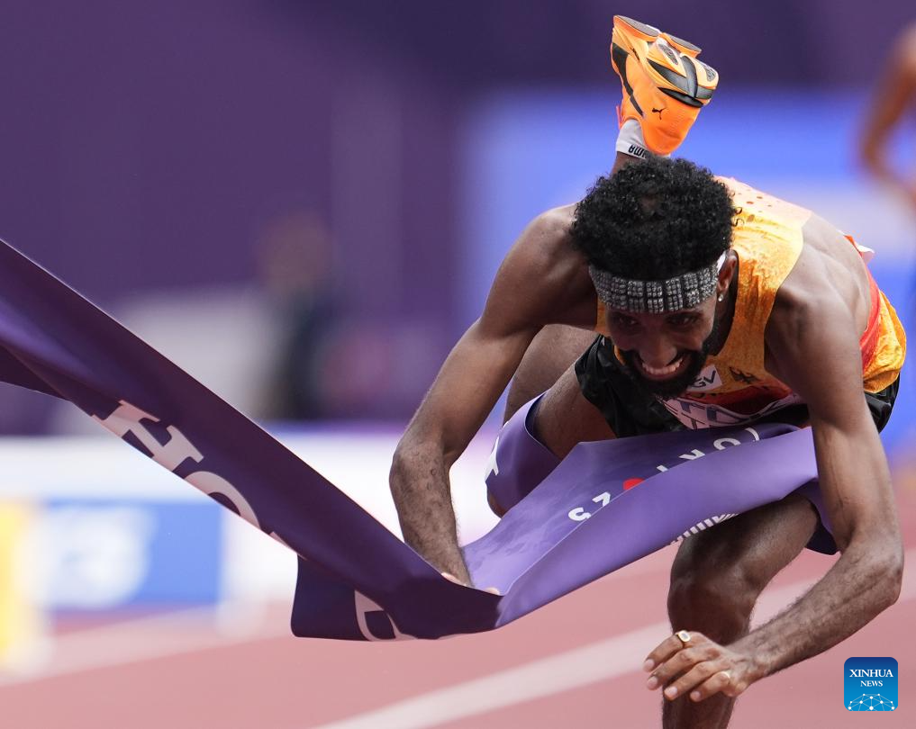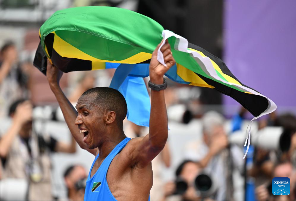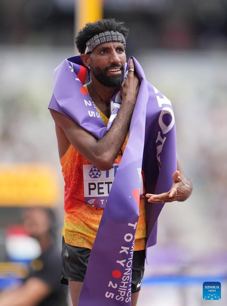 Gold medalist Alphonce Felix Simbu of Tanzania celebrates after the men's marathon final at the 2025 World Athletics Championships in Tokyo, Japan, Sept. 15, 2025. (Xinhua/Song Yanhua)