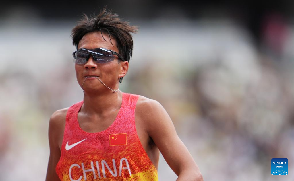 He Jie of China reacts after the men's marathon final at the 2025 World Athletics Championships in Tokyo, Japan, Sept. 15, 2025. (Xinhua/Li Gang)