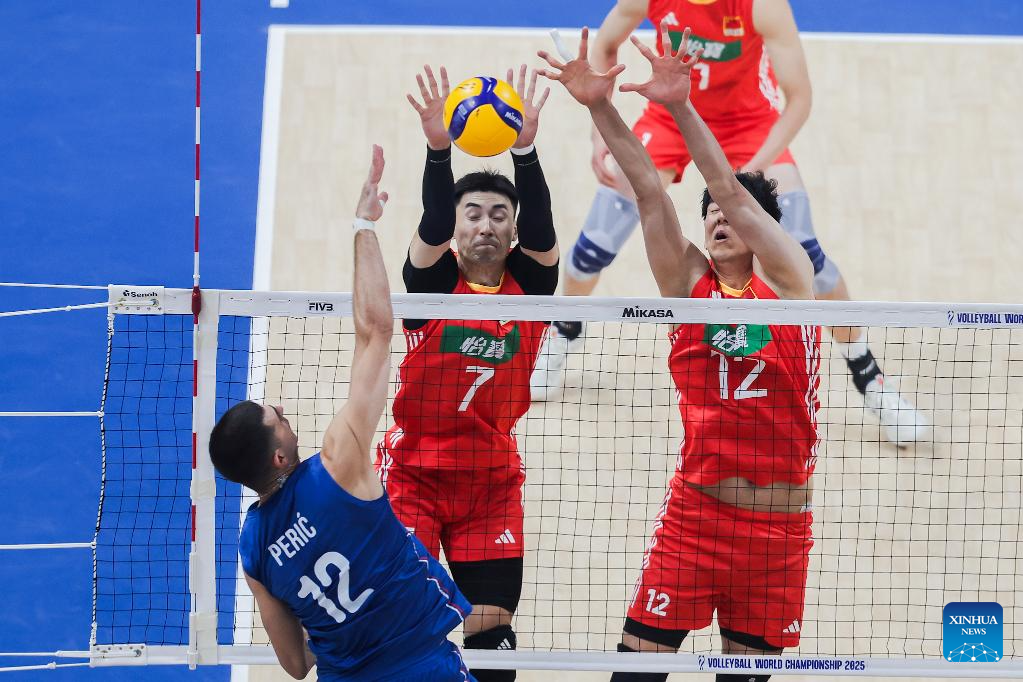 Pavle Peric (Front) of Serbia competes during the pool H match between China and Serbia at the FIVB Men's World Championship 2025 in Pasay City, the Philippines, on Sept. 16, 2025. (Xinhua/Rouelle Umali)
