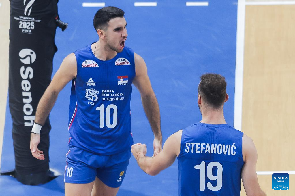 Players of Serbia celebrate during the pool H match between China and Serbia at the FIVB Men's World Championship 2025 in Pasay City, the Philippines, on Sept. 16, 2025. (Xinhua/Rouelle Umali)