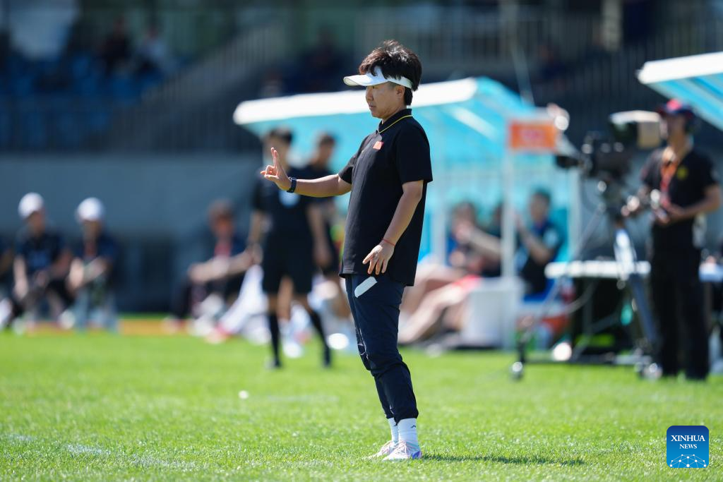 Bi Yan, head coach of Beijing Normal University, gestures during the Women's Group B match between Beijing Normal University (CHN) and Laval University (CAN) at 2025 FISU University World Cup Football in Dalian, northeast China's Liaoning Province, on Sept. 18, 2025. (Xinhua/Zheng Huansong)