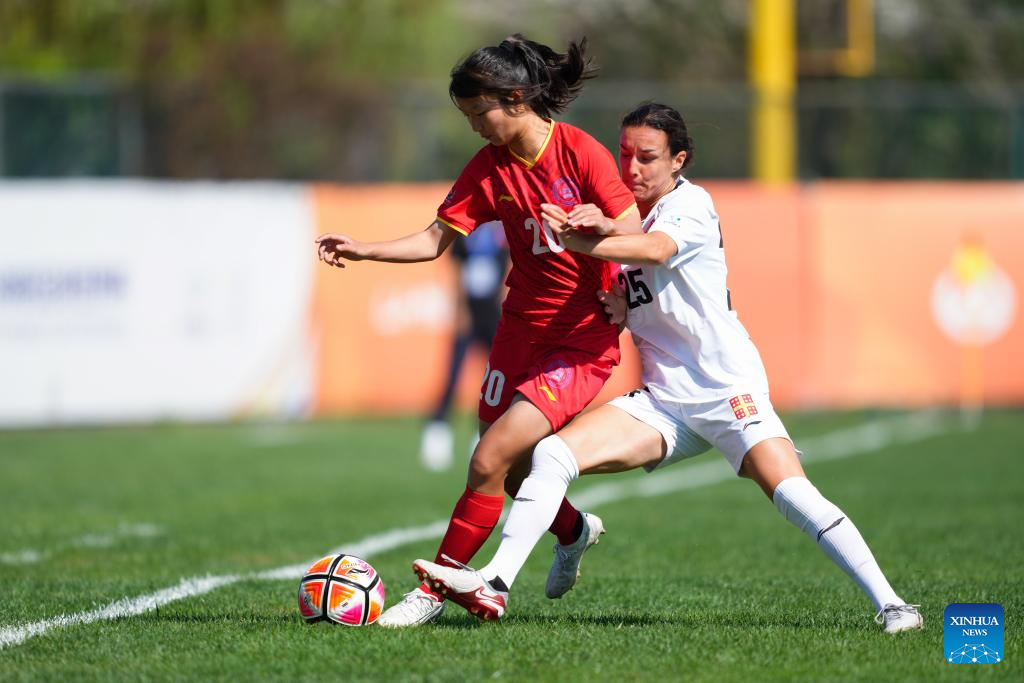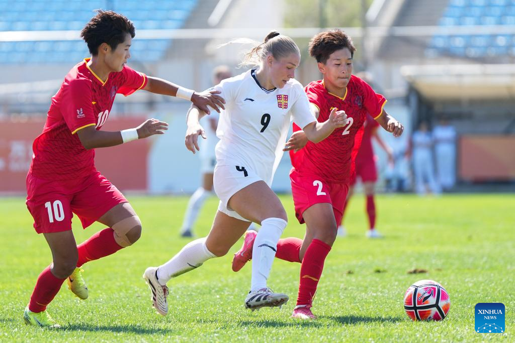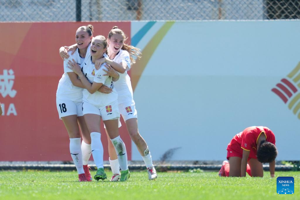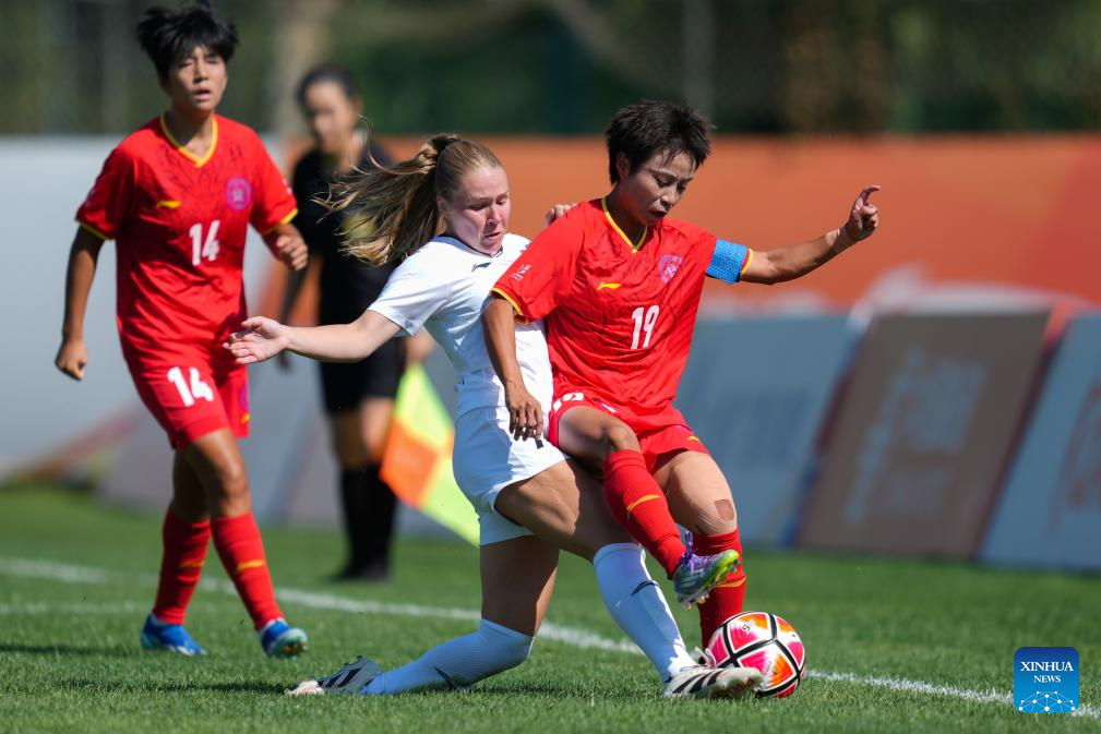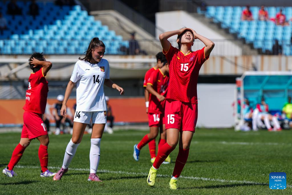 Lu Jiayu (front R) of Beijing Normal University reacts during the Women's Group B match between Beijing Normal University (CHN) and Laval University (CAN) at 2025 FISU University World Cup Football in Dalian, northeast China's Liaoning Province, on Sept. 18, 2025. (Xinhua/Zheng Huansong)
