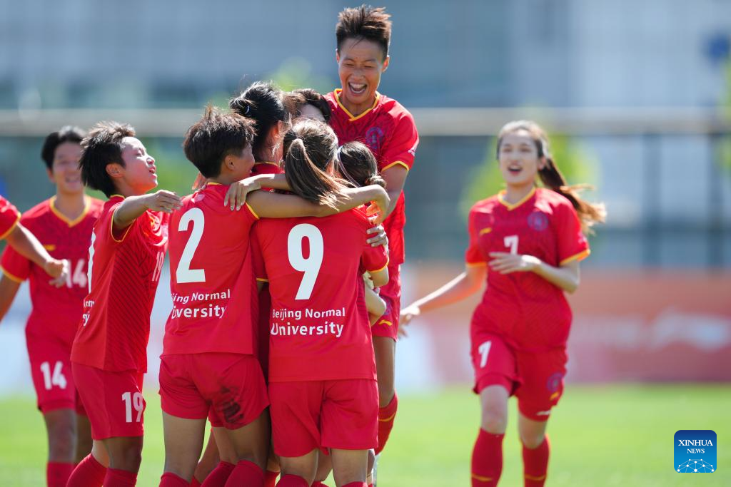 Players of Beijing Normal University celebrate a goal during the Women's Group B match between Beijing Normal University (CHN) and Laval University (CAN) at 2025 FISU University World Cup Football in Dalian, northeast China's Liaoning Province, on Sept. 18, 2025. (Xinhua/Zheng Huansong)