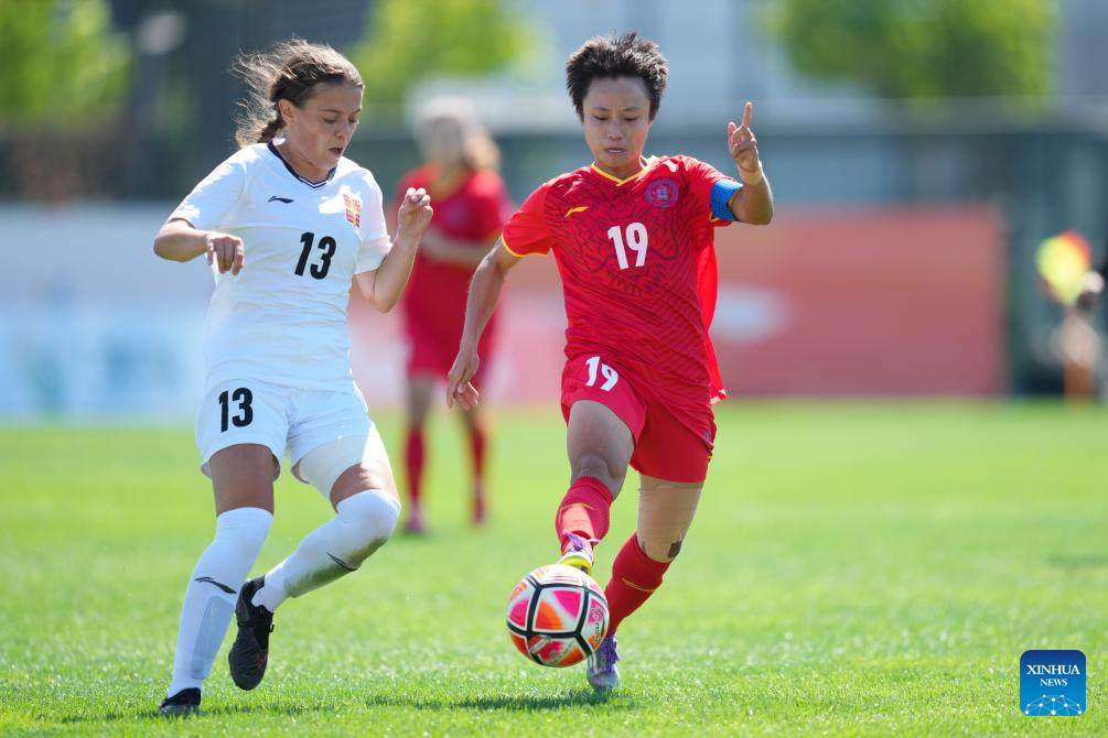 Wang Yirui (R) of Beijing Normal University competes against Emilie Grondines of Laval University during the Women's Group B match between Beijing Normal University (CHN) and Laval University (CAN) at 2025 FISU University World Cup Football in Dalian, northeast China's Liaoning Province, on Sept. 18, 2025. (Xinhua/Zheng Huansong)