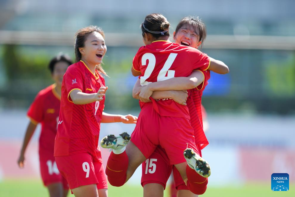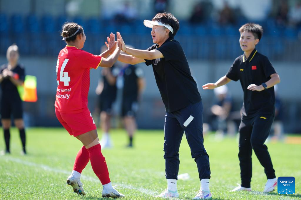 Ma Yulin (L) of Beijing Normal University celebrates with her head coach Bi Yan (C) after scoring during the Women's Group B match between Beijing Normal University (CHN) and Laval University (CAN) at 2025 FISU University World Cup Football in Dalian, northeast China's Liaoning Province, on Sept. 18, 2025. (Xinhua/Zheng Huansong)