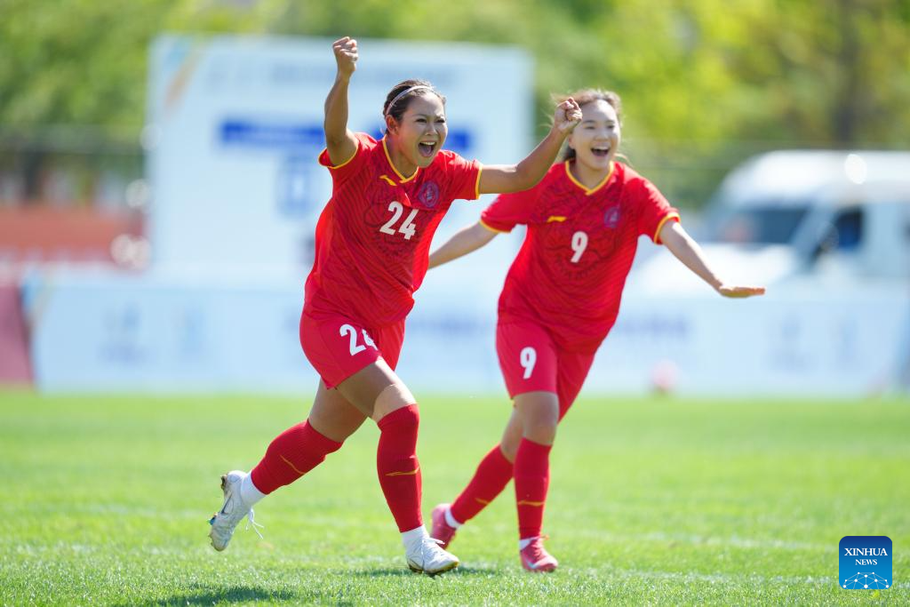 Ma Yulin (L) of Beijing Normal University celebrates her goal during the Women's Group B match between Beijing Normal University (CHN) and Laval University (CAN) at 2025 FISU University World Cup Football in Dalian, northeast China's Liaoning Province, on Sept. 18, 2025. (Xinhua/Zheng Huansong)