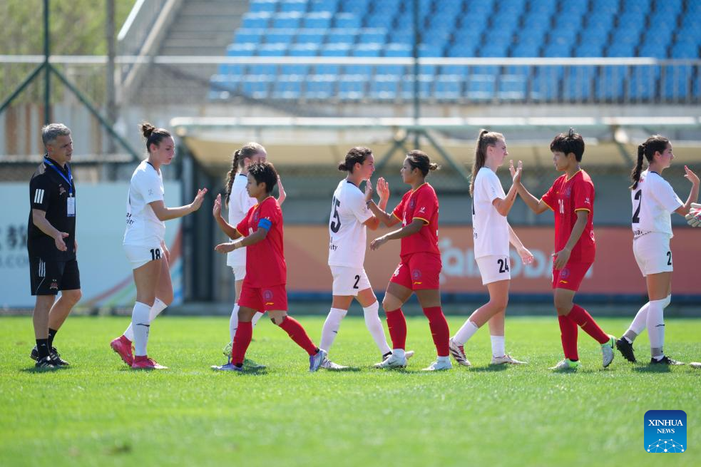 Players of both teams greet each other after the Women's Group B match between Beijing Normal University (CHN) and Laval University (CAN) at 2025 FISU University World Cup Football in Dalian, northeast China's Liaoning Province, on Sept. 18, 2025. (Xinhua/Zheng Huansong)