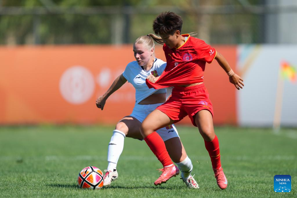 Ma Yulin (R) of Beijing Normal University vies with Melodie Lavigueur of Laval University during the Women's Group B match between Beijing Normal University (CHN) and Laval University (CAN) at 2025 FISU University World Cup Football in Dalian, northeast China's Liaoning Province, on Sept. 18, 2025. (Xinhua/Zheng Huansong)