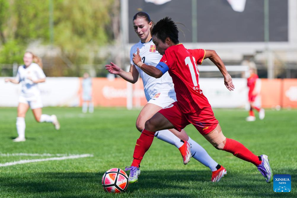 Zhang Linyan (R) of Beijing Normal University dribbles during the Women's Group B match between Beijing Normal University (CHN) and Laval University (CAN) at 2025 FISU University World Cup Football in Dalian, northeast China's Liaoning Province, on Sept. 18, 2025. (Xinhua/Zheng Huansong)