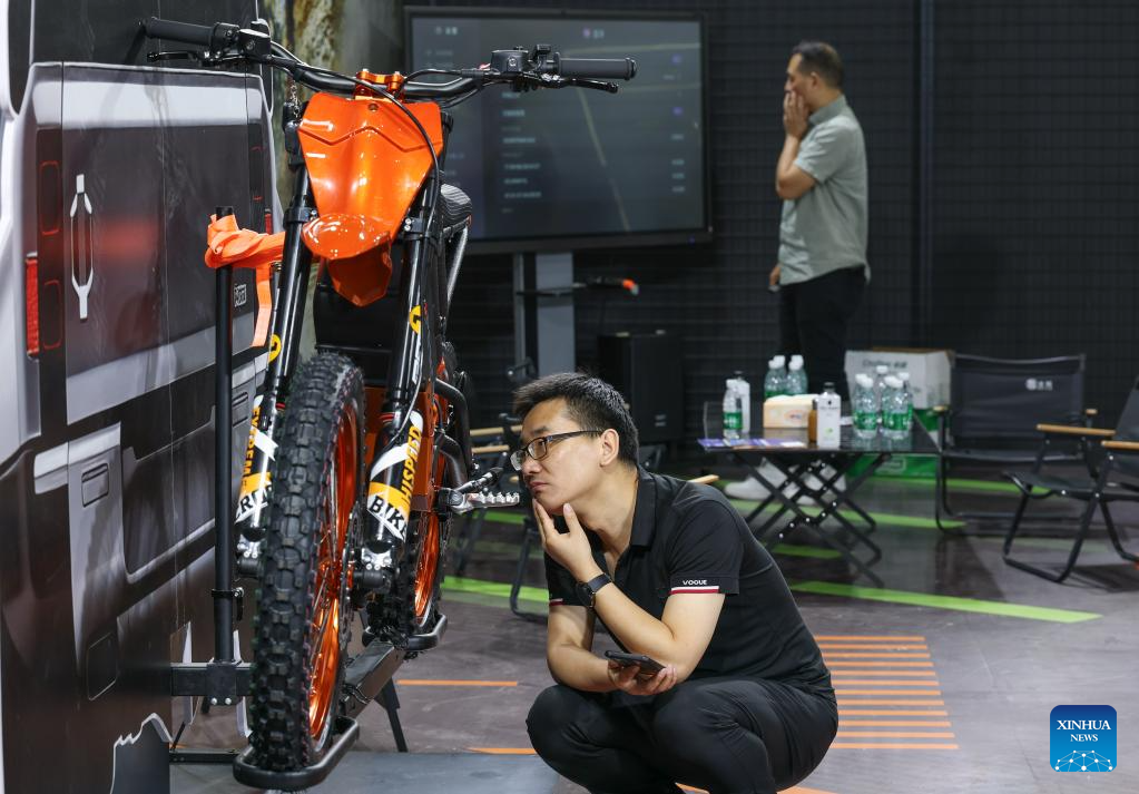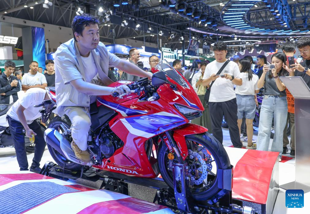 A visitors tries a domestically produced new energy motorcycle at an international motorcycle expo in Chongqing, southwest China, Sept. 19, 2025. The 23rd China International Motorcycle Expo is held in Chongqing from Sept. 19 to 22, with the participation of more than 900 enterprises from around the world. (Xinhua/Chen Cheng)