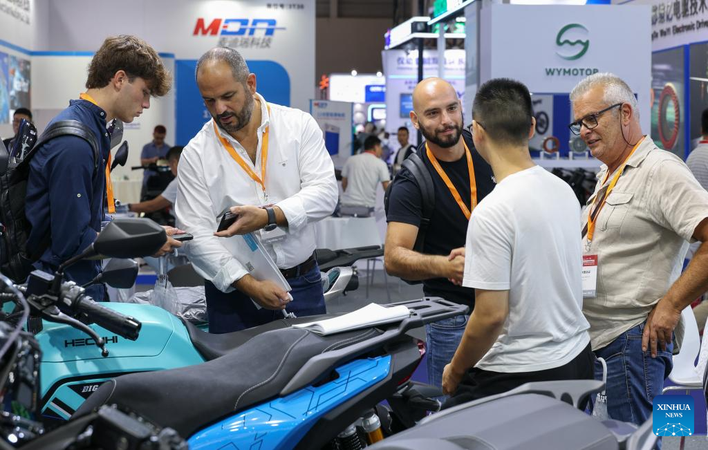 Merchants learn about a permanent magnet synchronous motor for motorcycle at an international motorcycle expo in Chongqing, southwest China, Sept. 19, 2025. The 23rd China International Motorcycle Expo is held in Chongqing from Sept. 19 to 22, with the participation of more than 900 enterprises from around the world. (Xinhua/Chen Cheng)
