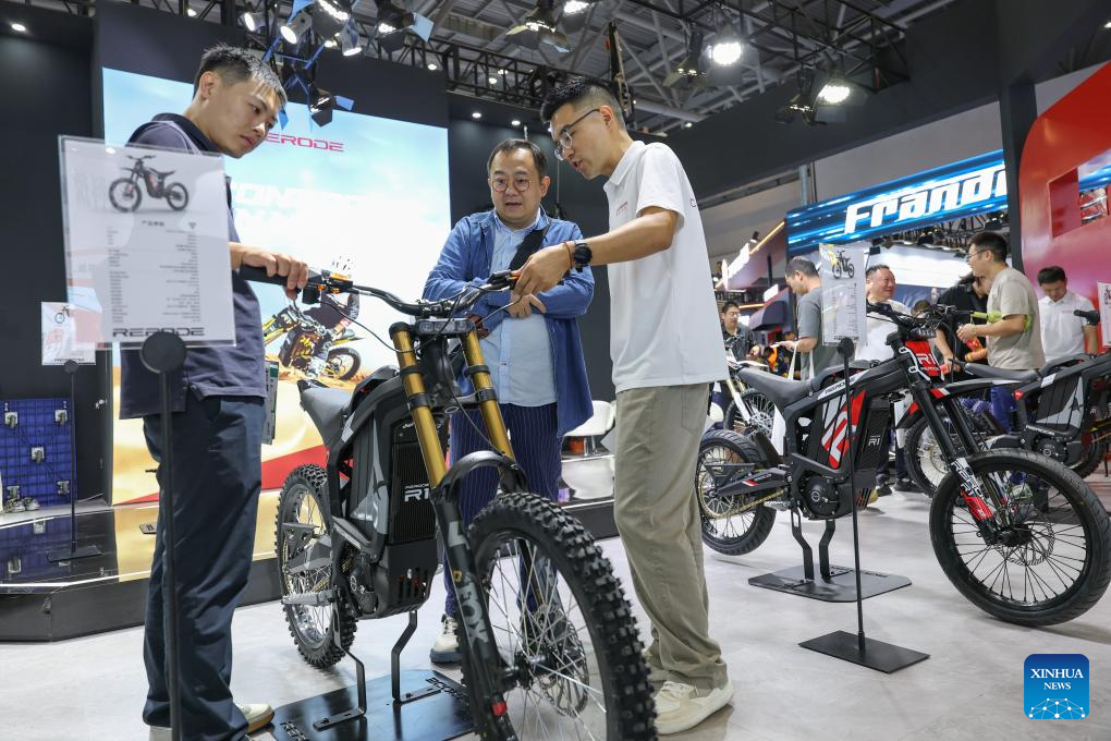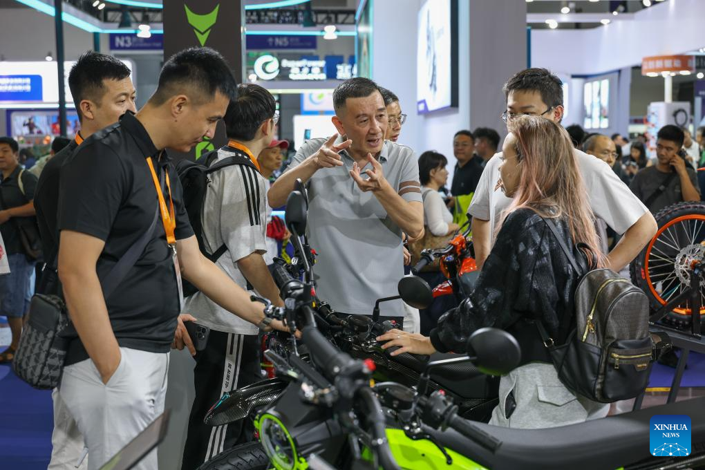 Visitors learn about the function of domestically produced new energy motorcycles at an international motorcycle expo in Chongqing, southwest China, Sept. 19, 2025. The 23rd China International Motorcycle Expo is held in Chongqing from Sept. 19 to 22, with the participation of more than 900 enterprises from around the world. (Xinhua/Chen Cheng)
