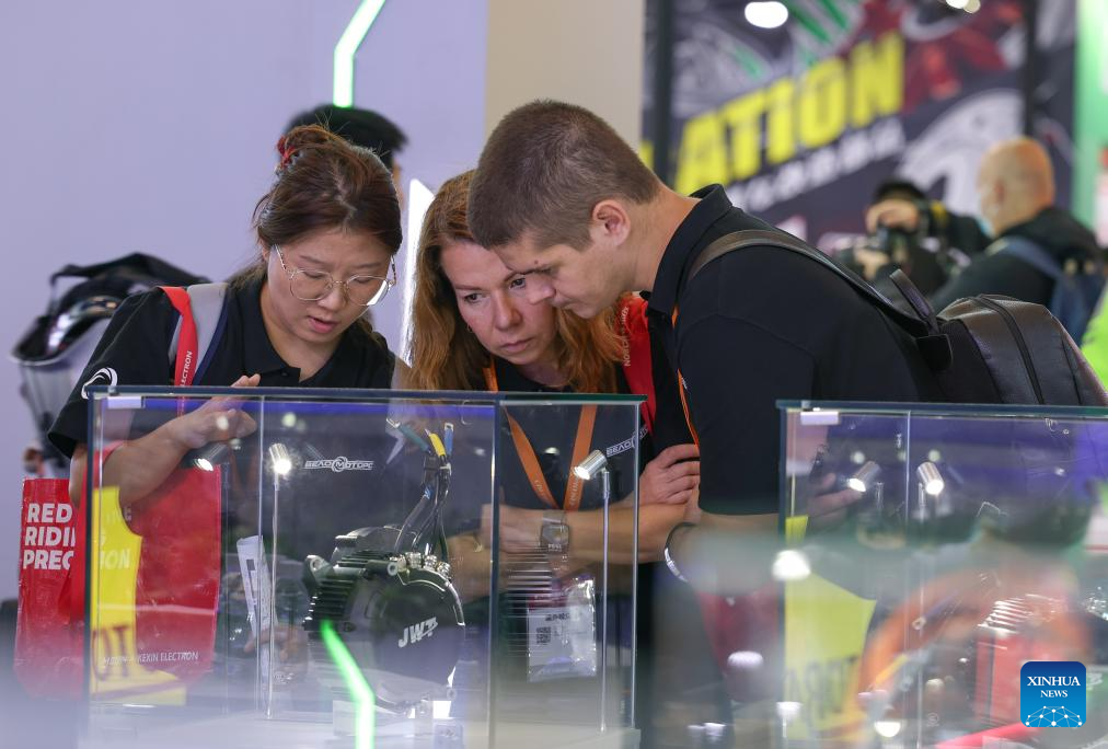 A visitor observes a motorcycle at an international motorcycle expo in Chongqing, southwest China, Sept. 19, 2025. The 23rd China International Motorcycle Expo is held in Chongqing from Sept. 19 to 22, with the participation of more than 900 enterprises from around the world. (Xinhua/Chen Cheng)