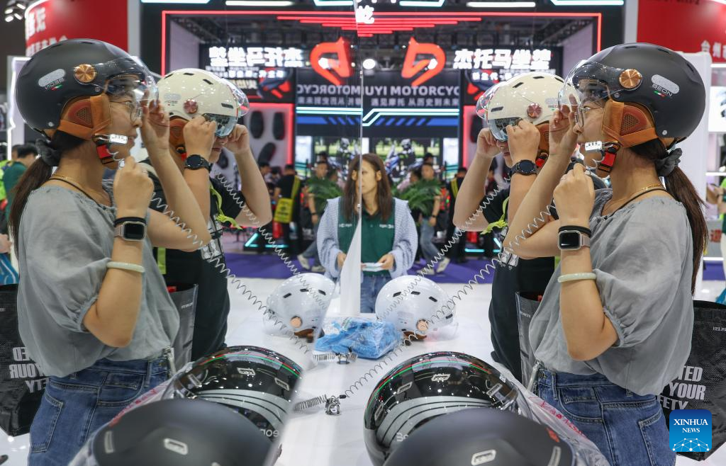 Visitors try on motorcycle helmets at an international motorcycle expo in Chongqing, southwest China, Sept. 19, 2025. The 23rd China International Motorcycle Expo is held in Chongqing from Sept. 19 to 22, with the participation of more than 900 enterprises from around the world. (Xinhua/Chen Cheng)