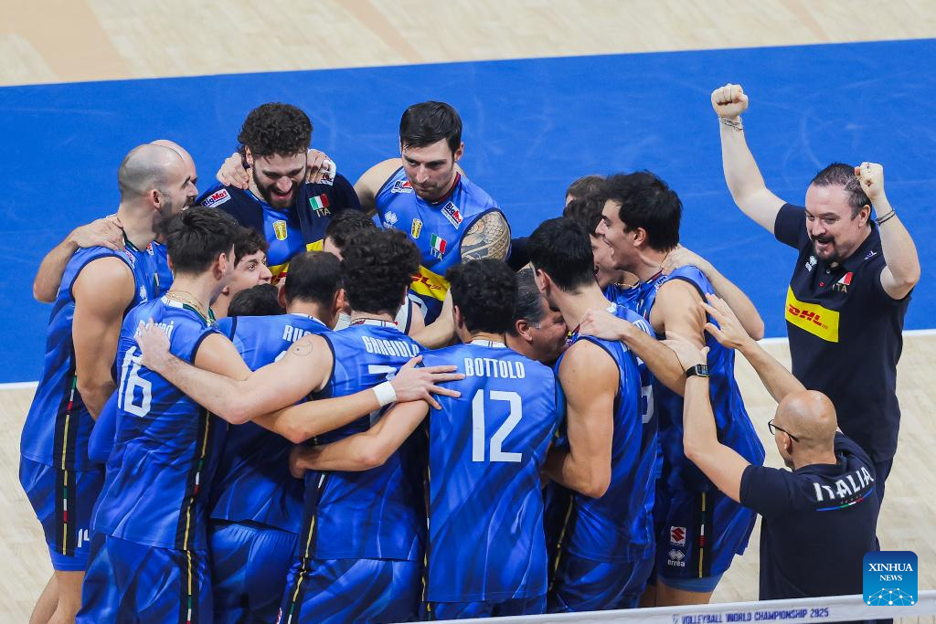 Players of Italy celebrate winning the quarterfinal match between Italy and Belgium at the FIVB Men's World Championship 2025 in Pasay City, the Philippines, Sept. 24, 2025. (Xinhua/Rouelle Umali)