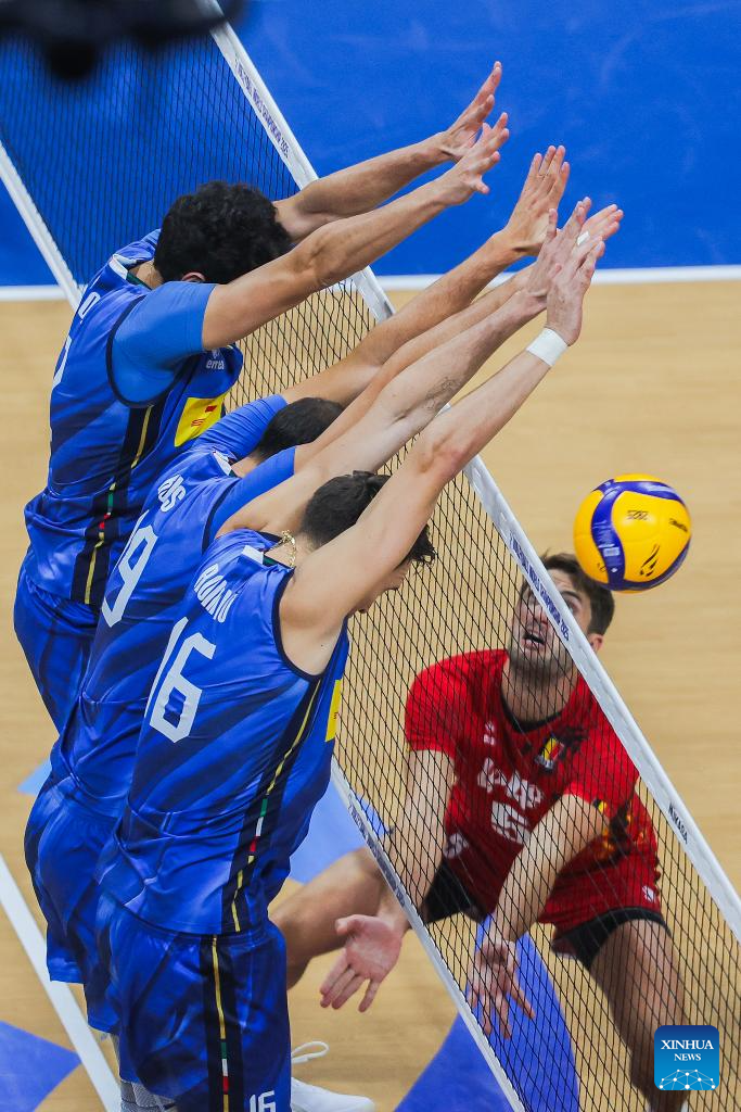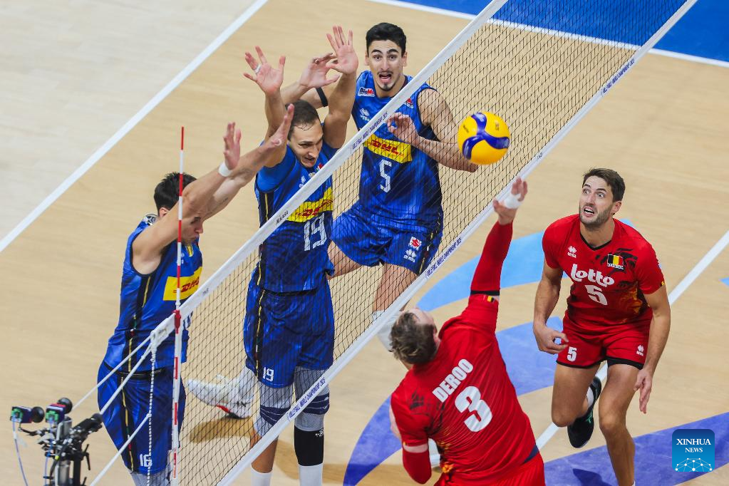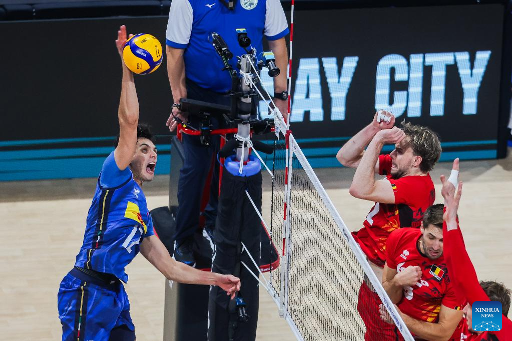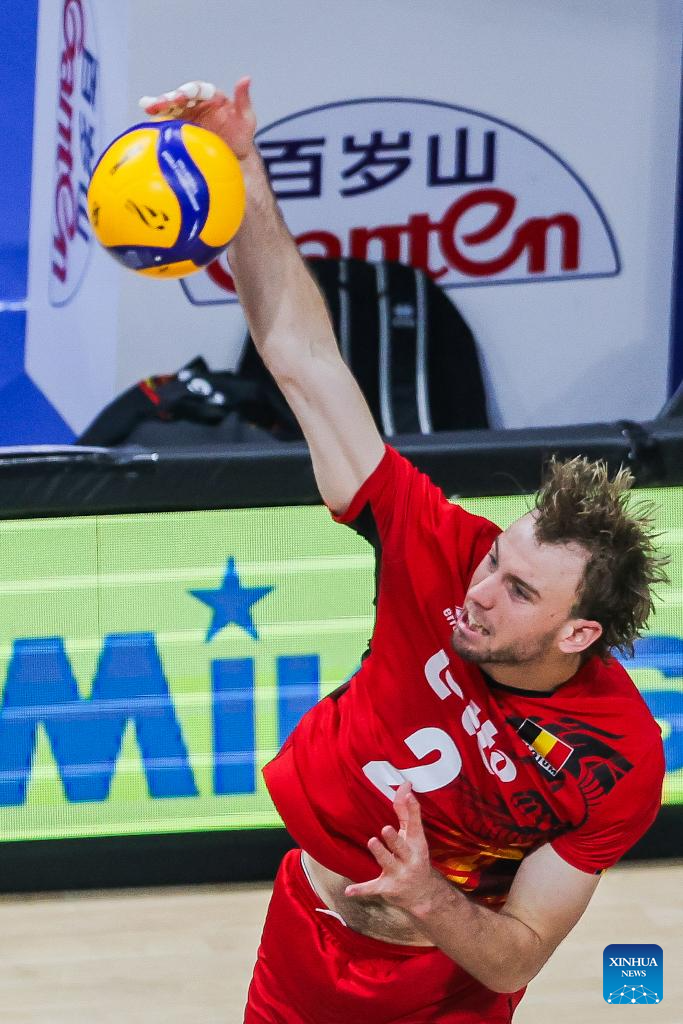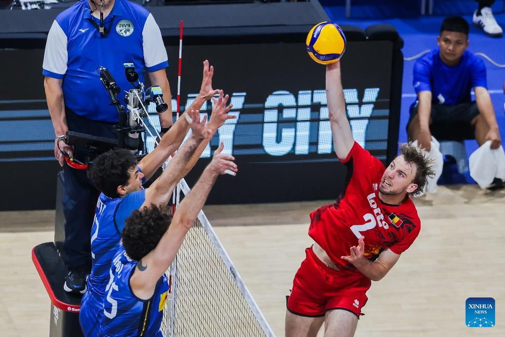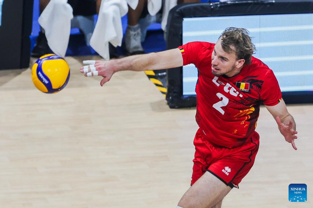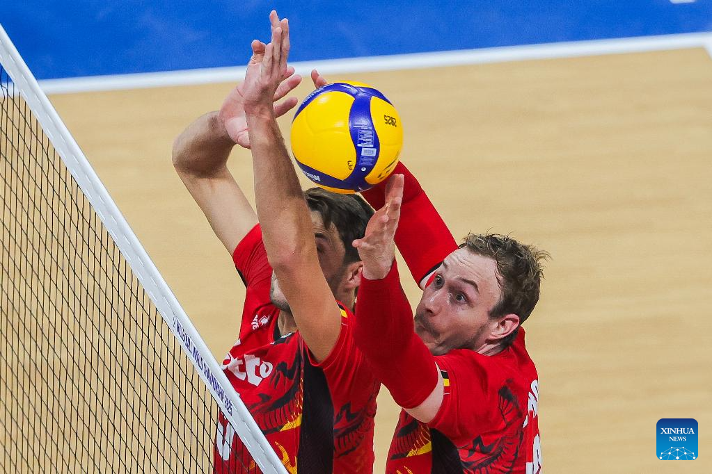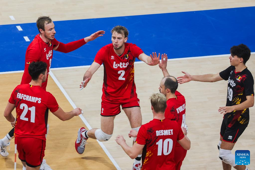 Players of Belgium compete during the quarterfinal match between Italy and Belgium at the FIVB Men's World Championship 2025 in Pasay City, the Philippines, Sept. 24, 2025. (Xinhua/Rouelle Umali)