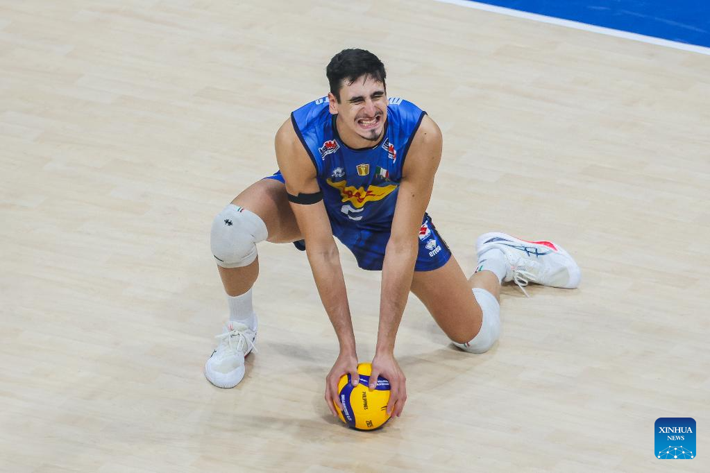 Alessandro Michieletto of Italy reacts during the quarterfinal match between Italy and Belgium at the FIVB Men's World Championship 2025 in Pasay City, the Philippines, Sept. 24, 2025. (Xinhua/Rouelle Umali)